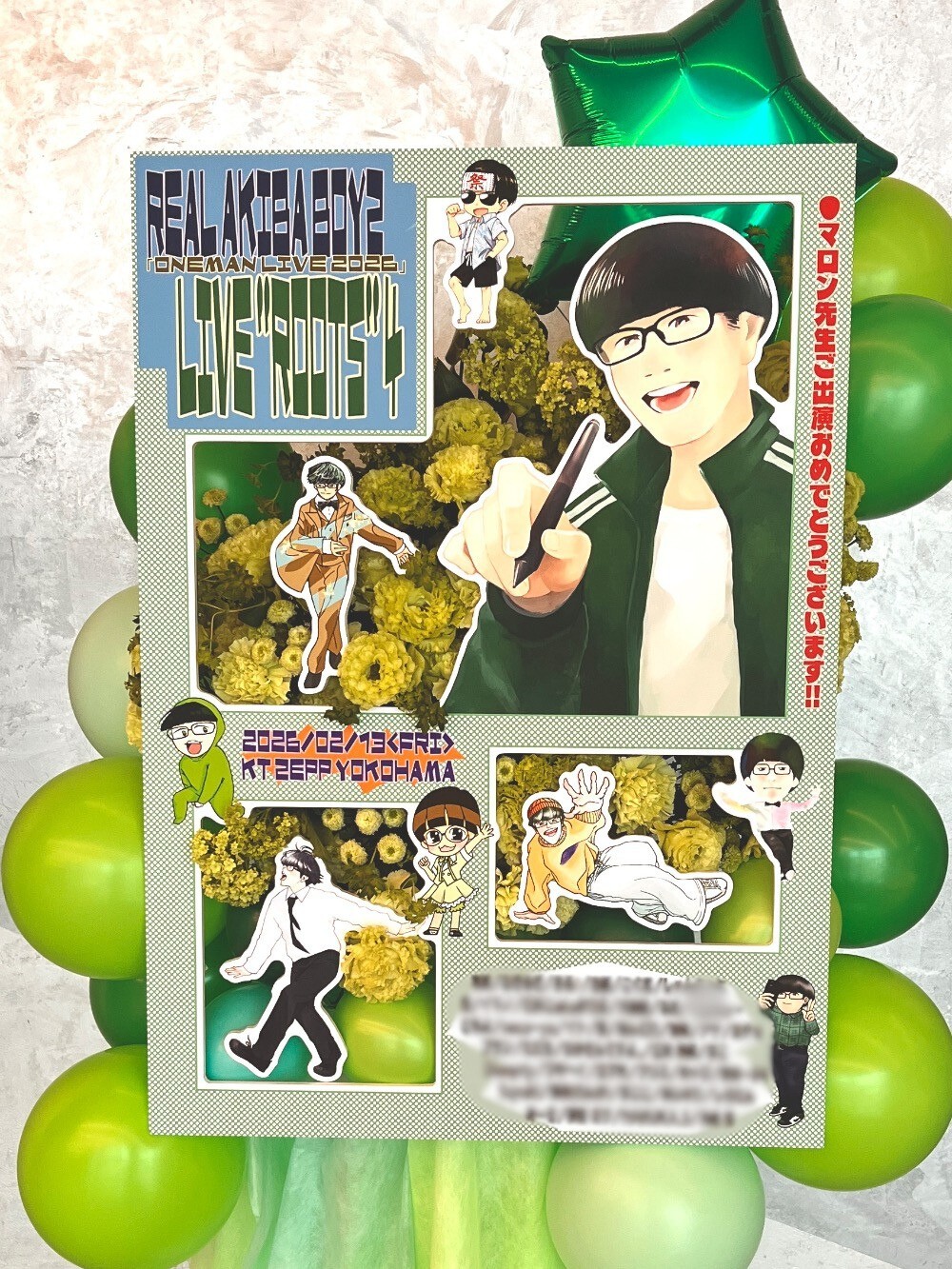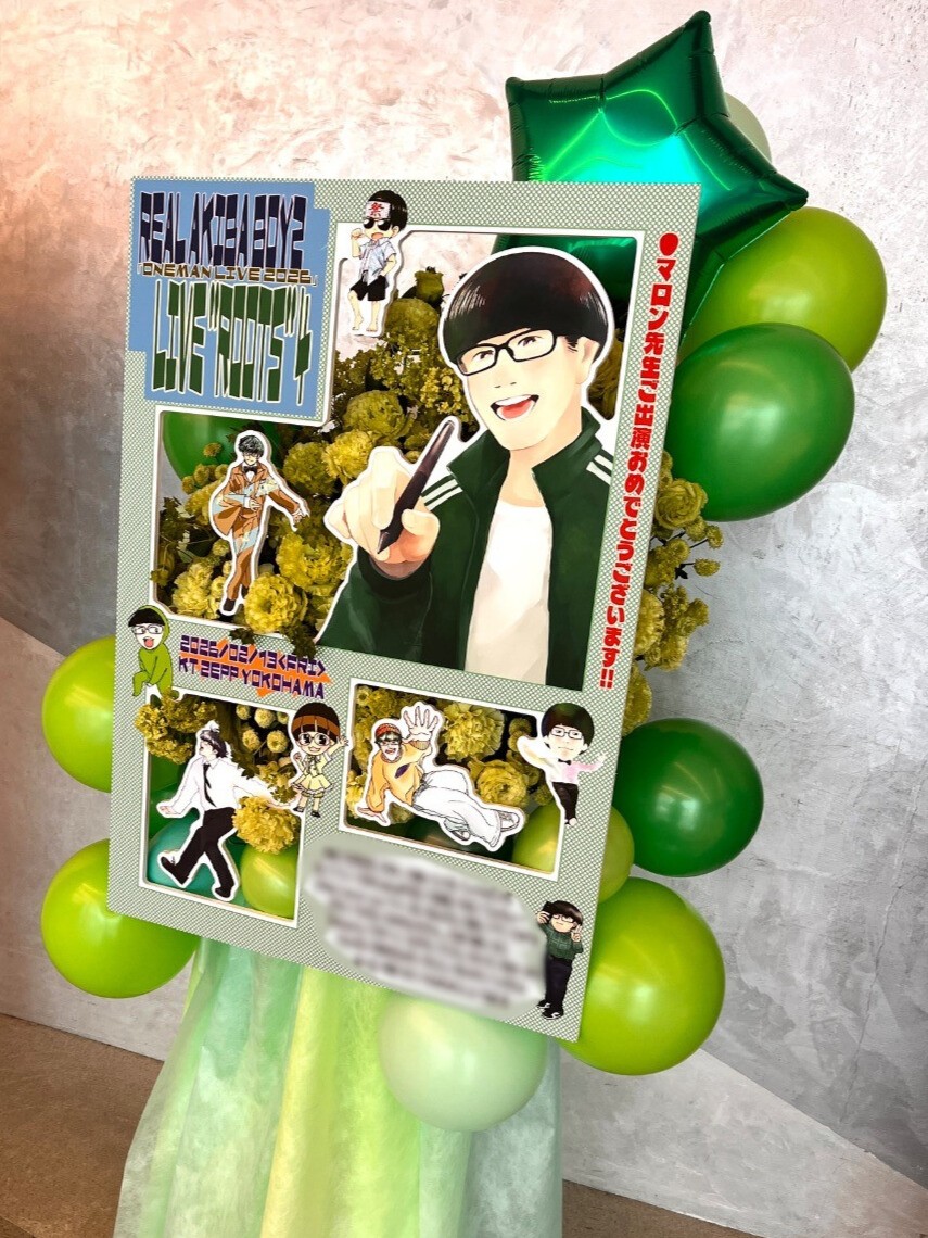 #52,500円 #公演・出演祝い #フラワーデザイナー宮崎 #グリーン #スタンド花 #推し花 #Zepp横浜 #リアルアキバボーイズ #マロン #オリジナル立て札 #パネル装飾 #バルーン #インパクト #ユニーク