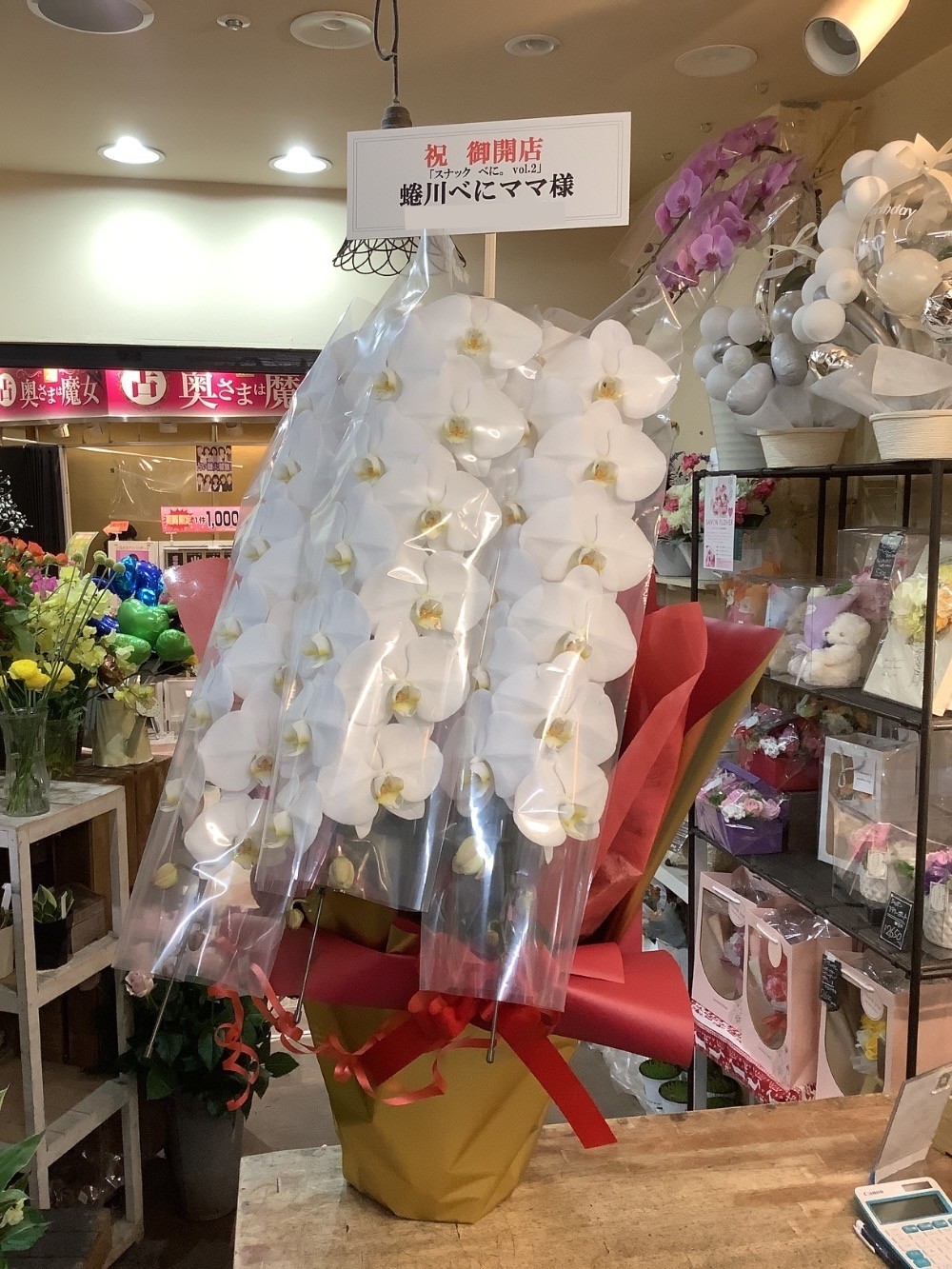 せっかくのスナックをイメージした企画で夜のお店に似合うよう胡蝶蘭単体にしました。