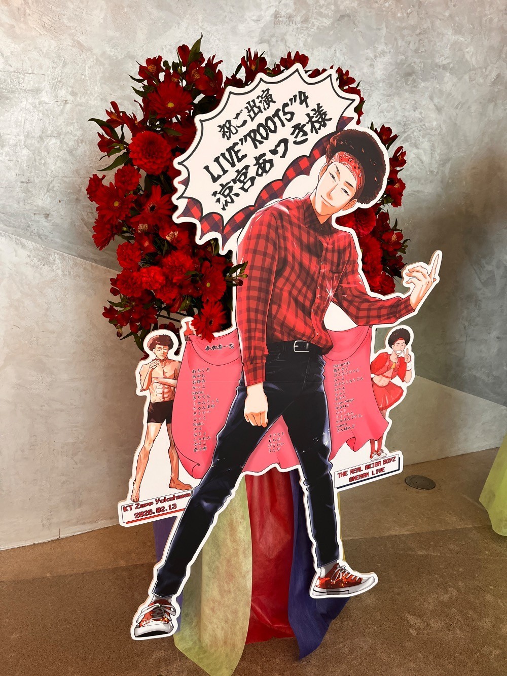 圧倒的な存在感でREAL AKIBA BOYZのセンターを務める涼宮あつきさん。その魅力を存分に伝えられるフラスタにしたくて、ROOTSの名作「ロキ」ラストの決めポーズを再現した等身大パネルを制作し、メンバーカラーである赤いお花で華やかに仕上げていただきました。迫力あふれるフラスタとなり、感無量です!