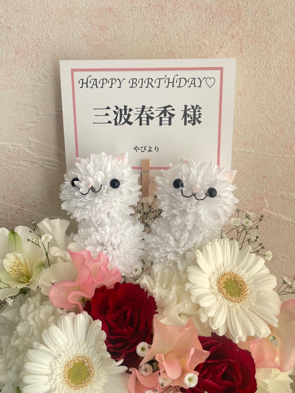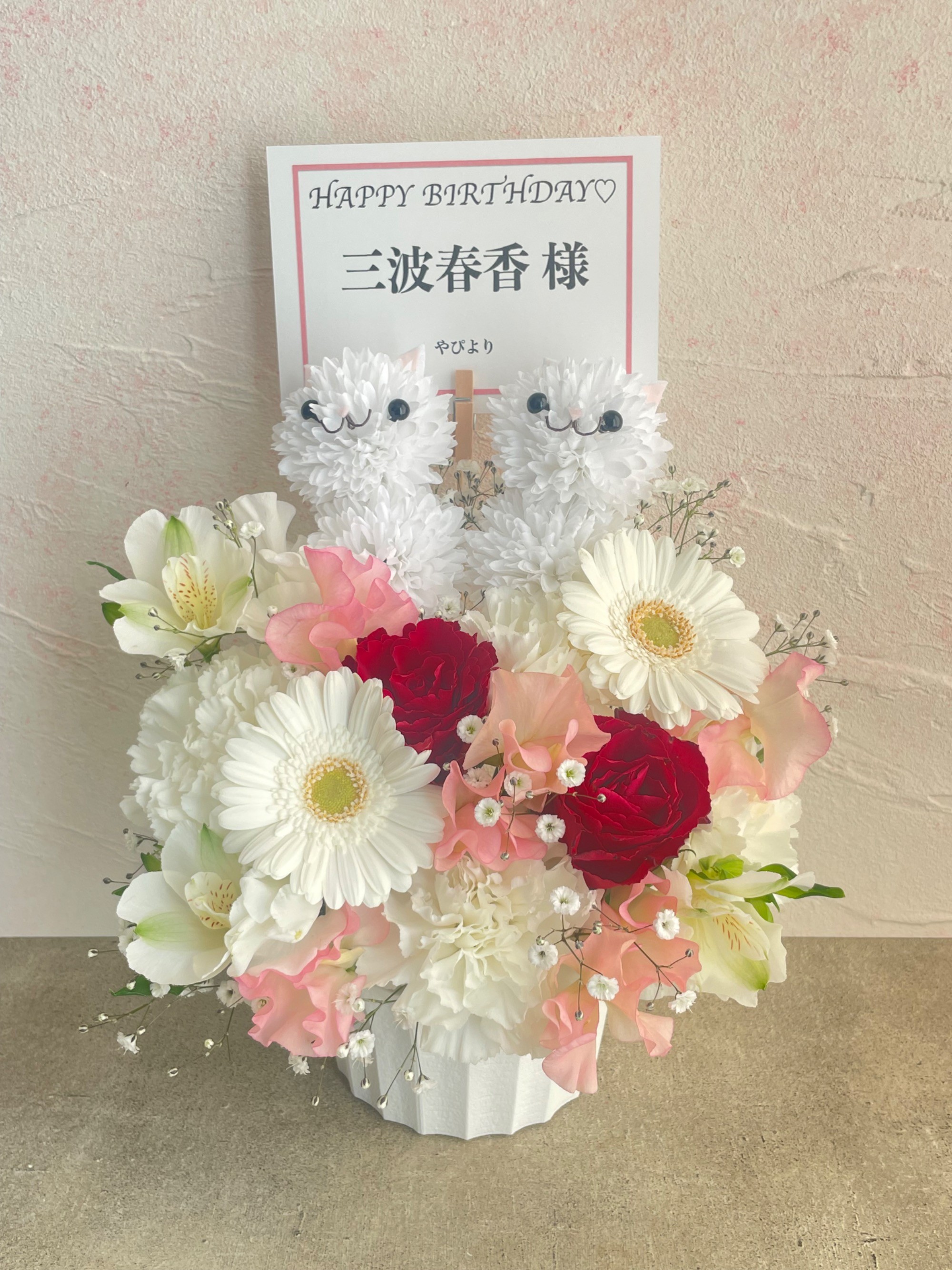 三波さんのお誕生日が2/22なので猫のアニマルアレンジを2つと、メンバーカラーの白を基本に赤やピンク色を混ぜてオーダーをお願いしたところ、とても可愛い素敵なアレンジメントにしていただけました。