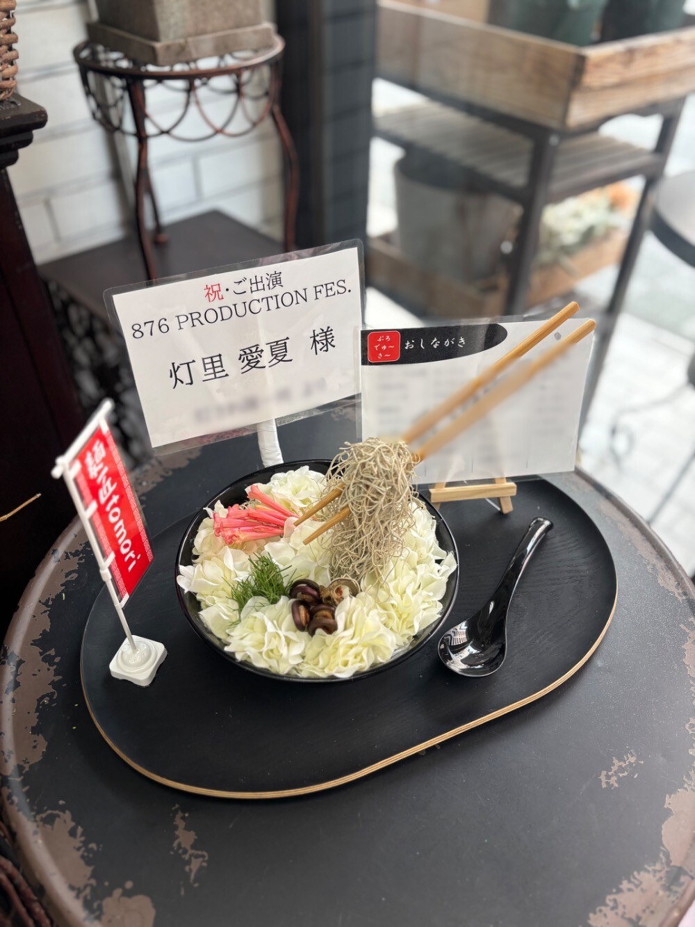 愛夏さんが福岡の豚骨ラーメンをこよなく愛していることから、どんぶりを使用して豚骨ラーメンを模したアレンジメントをお願いしました。