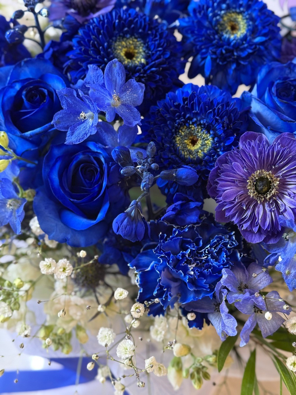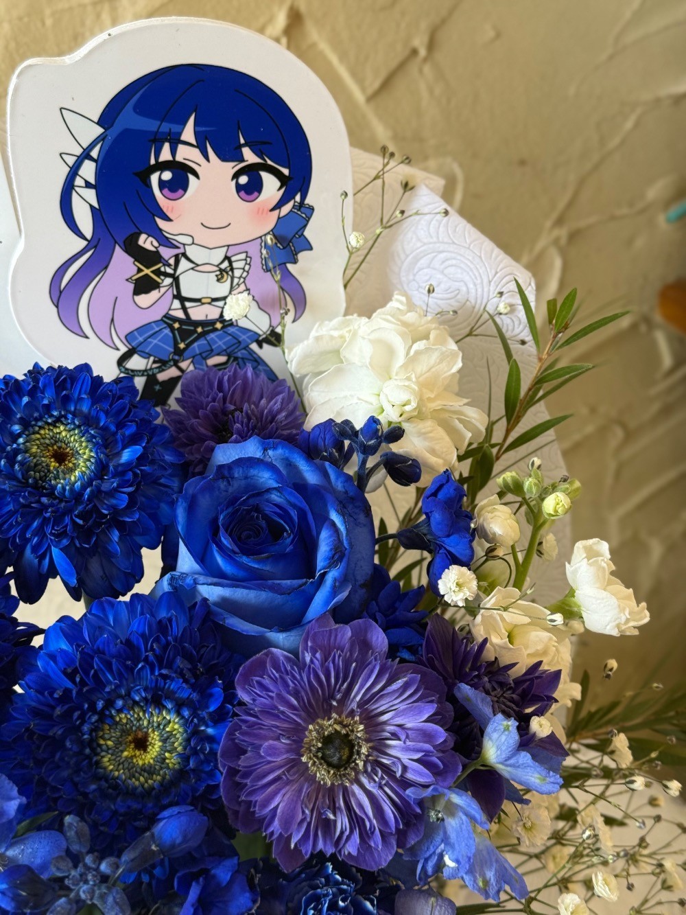 イメージカラーである青色を中心に据え、衣装を意識した白色で囲ってもらうことで一目で誰に宛てたお花なのかを分かるように作っていただきました。