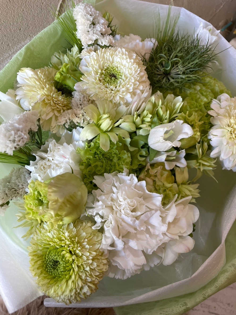 グリーンと白を基調におつくりした結婚記念日祝い花