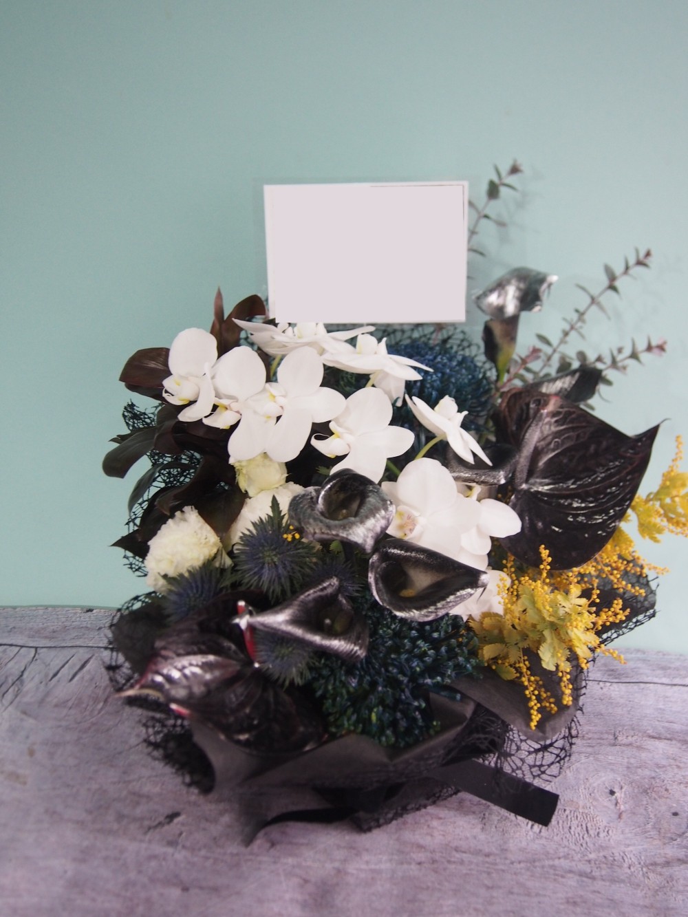 コチョウランやカラー、マム、エレンジューム、アンスリュームユーカリなど寒色系のお花に、ミモザアカシアの黄色をあわせ、お作りいたしました。 お喜びいただけますように。。。