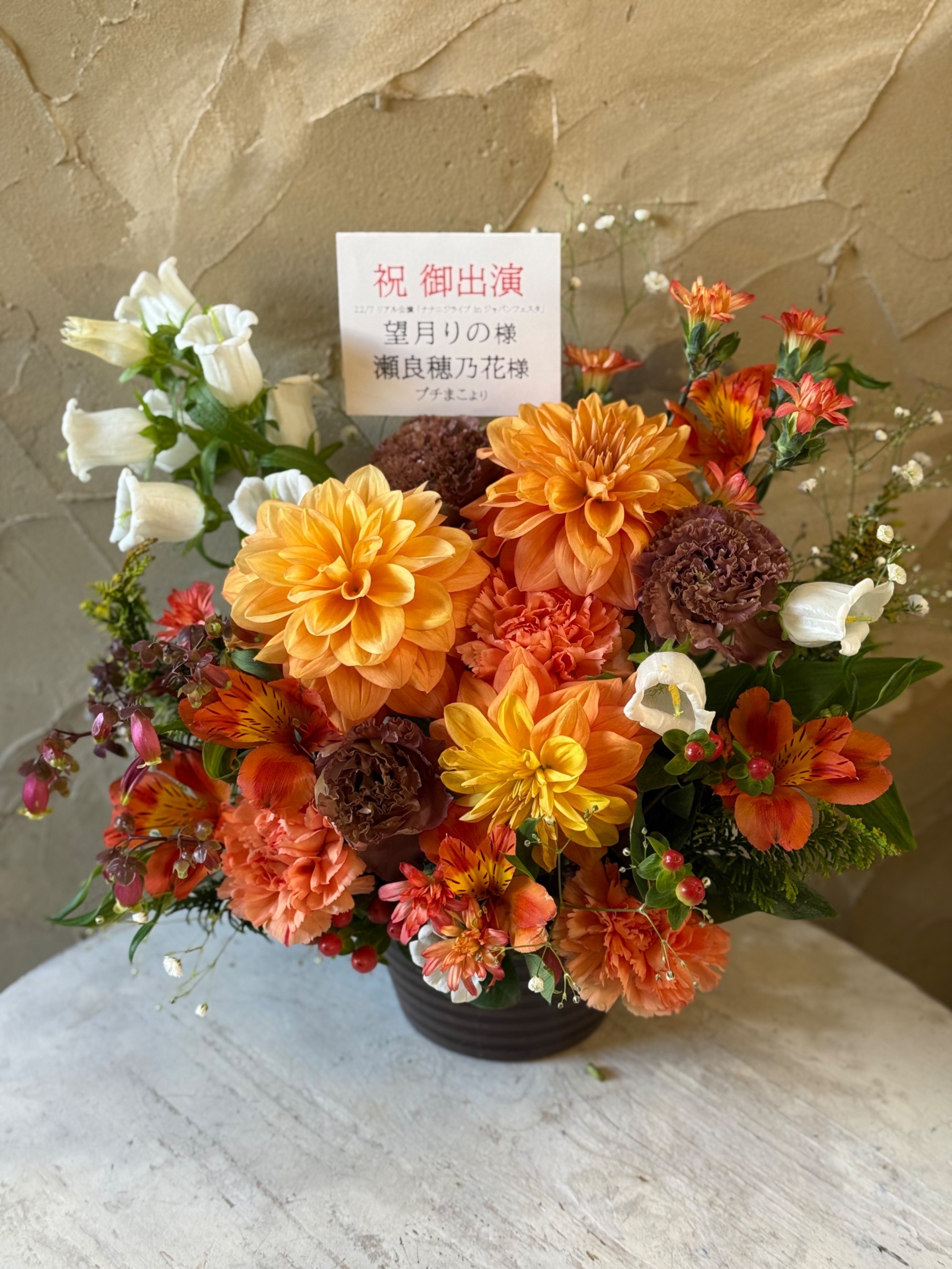 #6,000円-9,000円 #公演・出演祝い #フラワーデザイナー牧 #オレンジ #楽屋花 #推し花 #西新井文化ホール #ナナニジ #望月りの #瀬良穂乃花