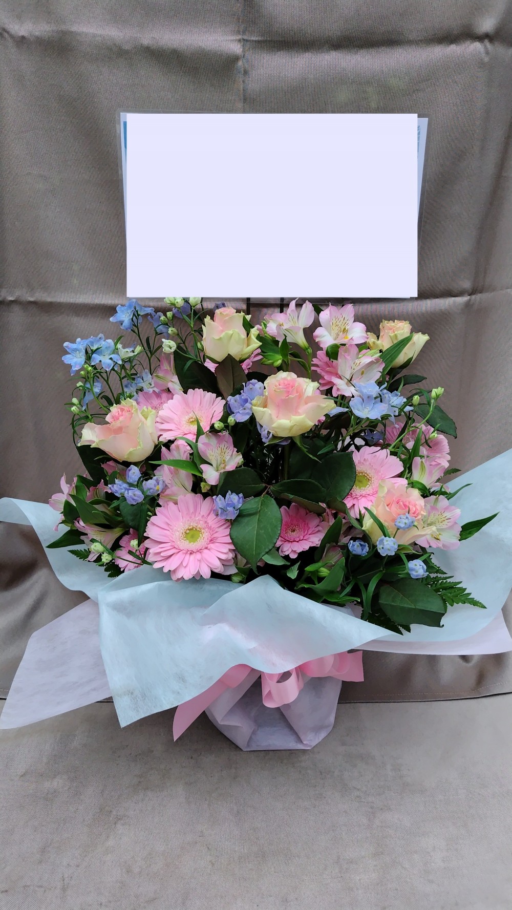乃木坂46の岩本蓮加さん、並びに梅澤美波さんにお送りしたい花。ということでお二人のサイリウムカラーである赤ピンク、青水色のお花をとオーダーさせていただきました。お花の指定は特に行っておりません。