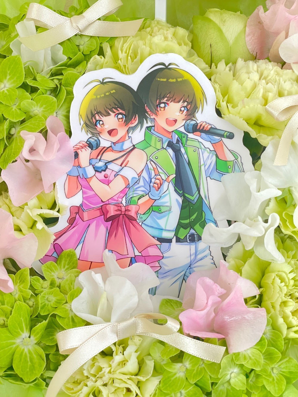 ハート型の形のアレンジメントに、キャラクターの個人カラーである黄緑色、衣装のピンク色と白色のお花をアクセントに可愛らしい雰囲気で制作をお願いしました。