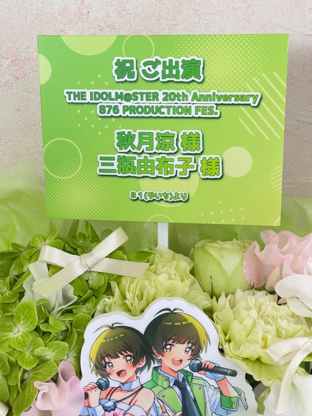 #11,000円-14,000円 #公演・出演祝い #フラワーデザイナー成田 #グリーン #楽屋花 #推し花 #日本工学院アリーナ #秋月涼 #三瓶由布子 #声優 #アイマスシリーズ #オリジナル立て札 #パネル装飾 #リボン