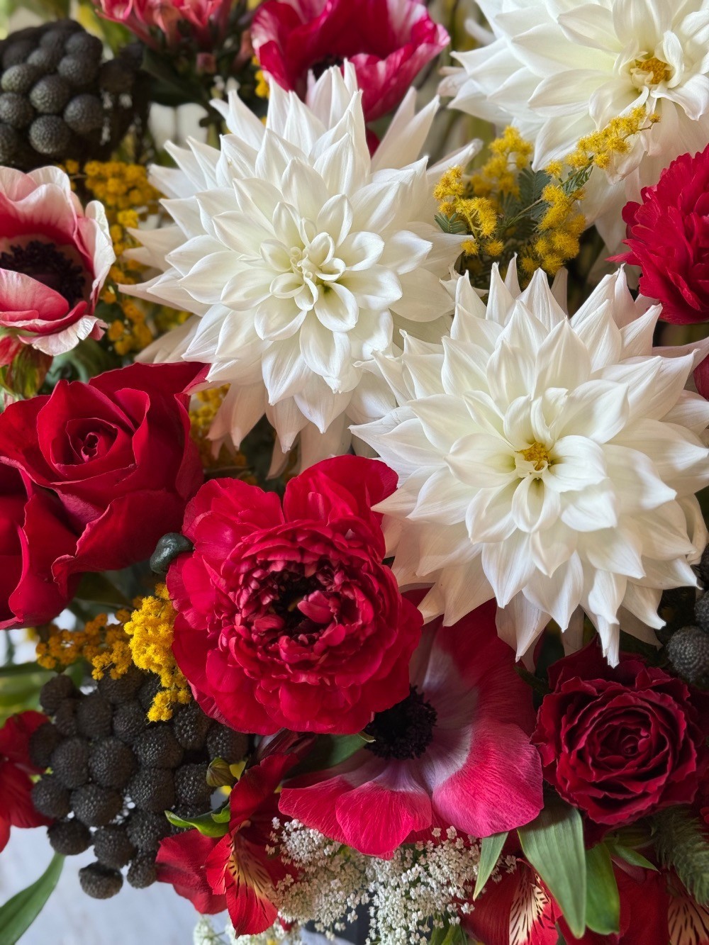 全体にシックな色合いでまとめております。 主なお花は、ダリア、八重咲きガーベラ、ラナンキュラス、ミモザ、レースフラワー、アネモネ、バラ、などです。