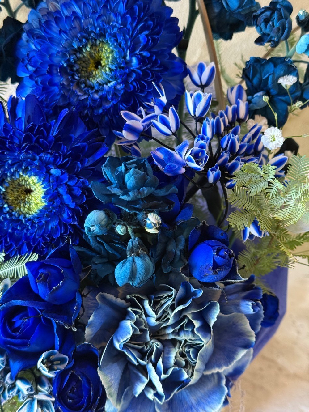 好きなバンドさんの初ツアーのお祝いに、バンドカラーである濃い目の青をメインにした青系統のみ(アクセントの白や葉の緑を除いて)のアレンジをお願いしました。