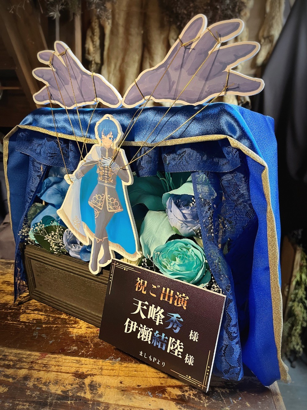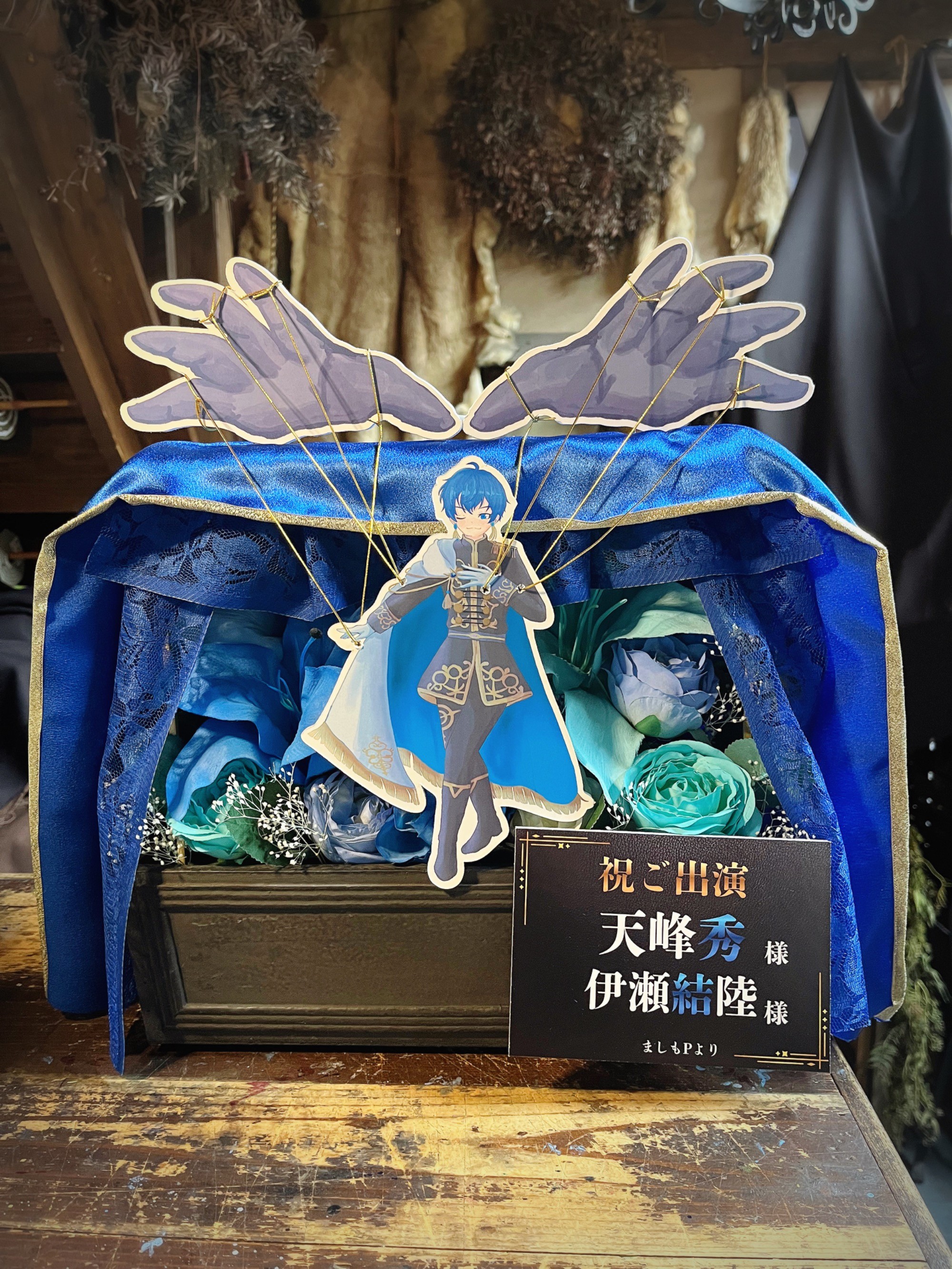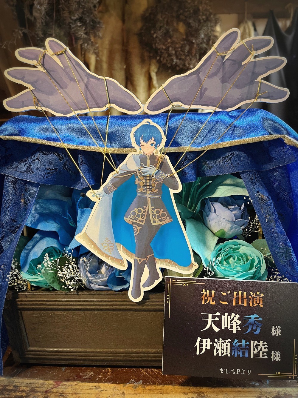 #20,000円-30,000円 #公演・出演祝い #フラワーデザイナー青山 #水色 #造花 #楽屋花 #推し花 #幕張メッセ #天峰秀 #伊瀬結陸 #声優 #アイマスシリーズ #アイドルマスターsideM #オリジナル立て札 #パネル装飾 #ユニーク #シック