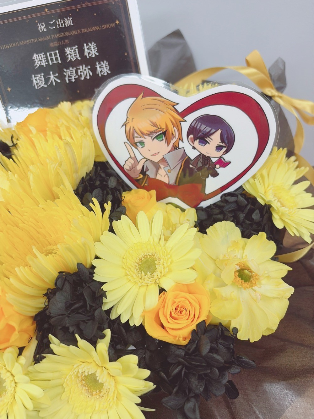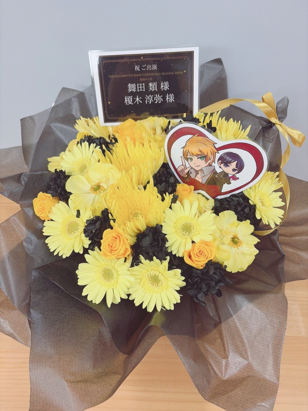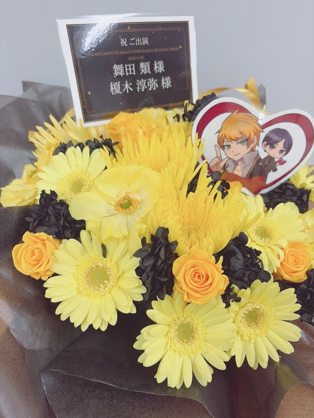 #10,000円 #公演・出演祝い #フラワーデザイナー志村 #黄 #楽屋花 #推し花 #幕張メッセ #舞田類 #榎木淳弥 #声優 #アイマスシリーズ #アイドルマスターsideM #オリジナル立て札 #パネル装飾 #シック #リボン