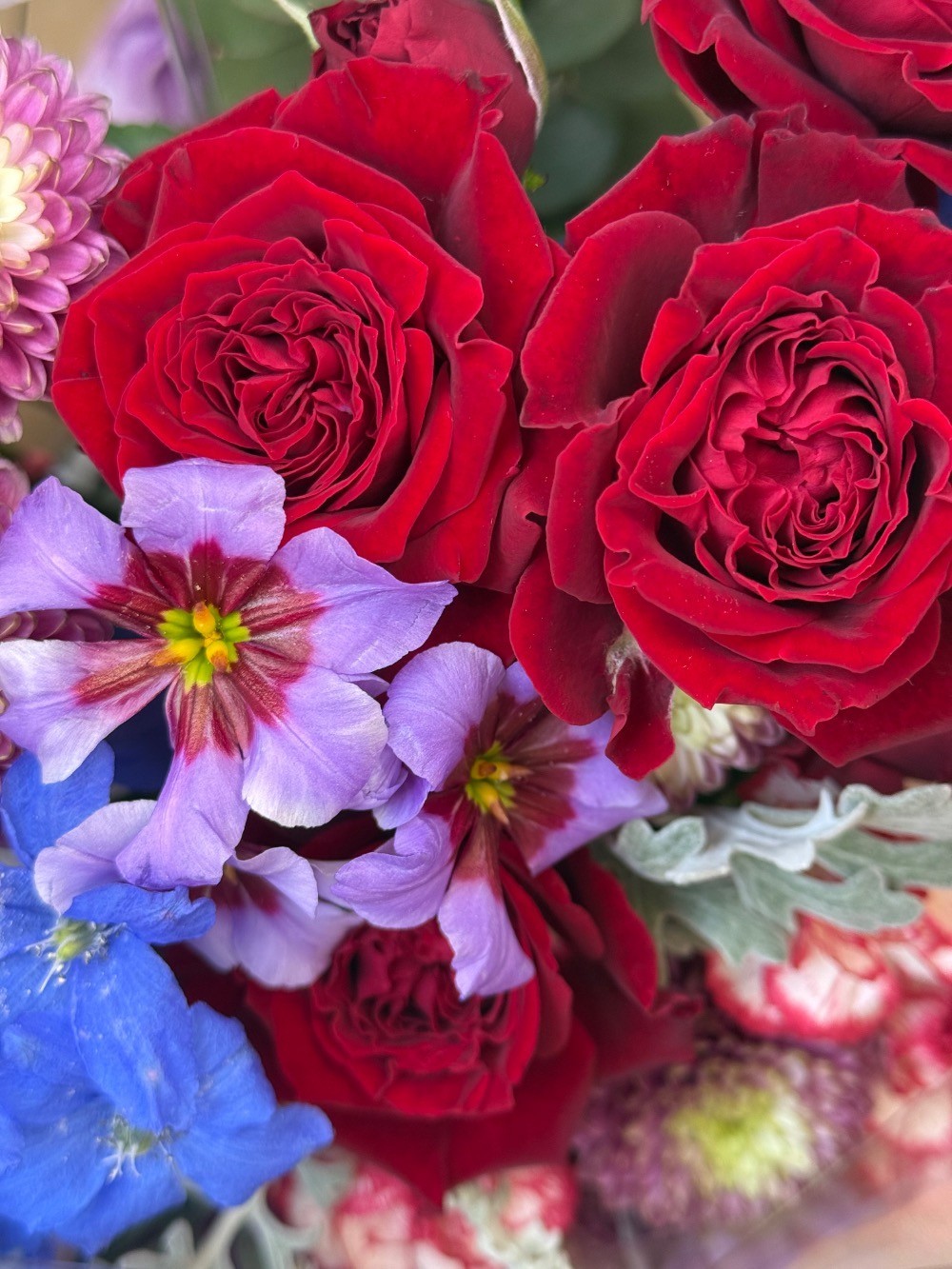 シックでいて華やかな色合いでまとめております。 主なお花は、バラ、カーネーション、マム、カンパニュラ、かすみ草、モカラ(蘭)スターチス、などです。