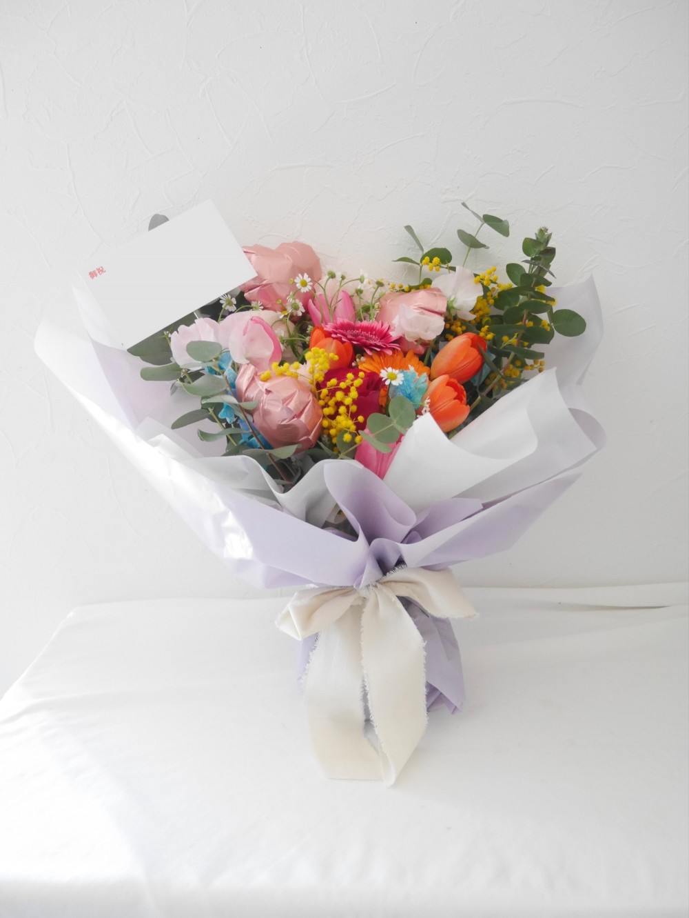 春らしいお花で春らしい花束とお花の種類や色はいくつか指定させていただきました。数は指定したものとお任せしたものがあります。予算内に収まるようにほぼお任せしました。
