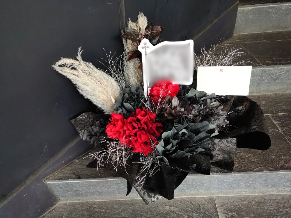 黒を基調にシックな雰囲気でおつくりした ご出演祝い花・楽屋花