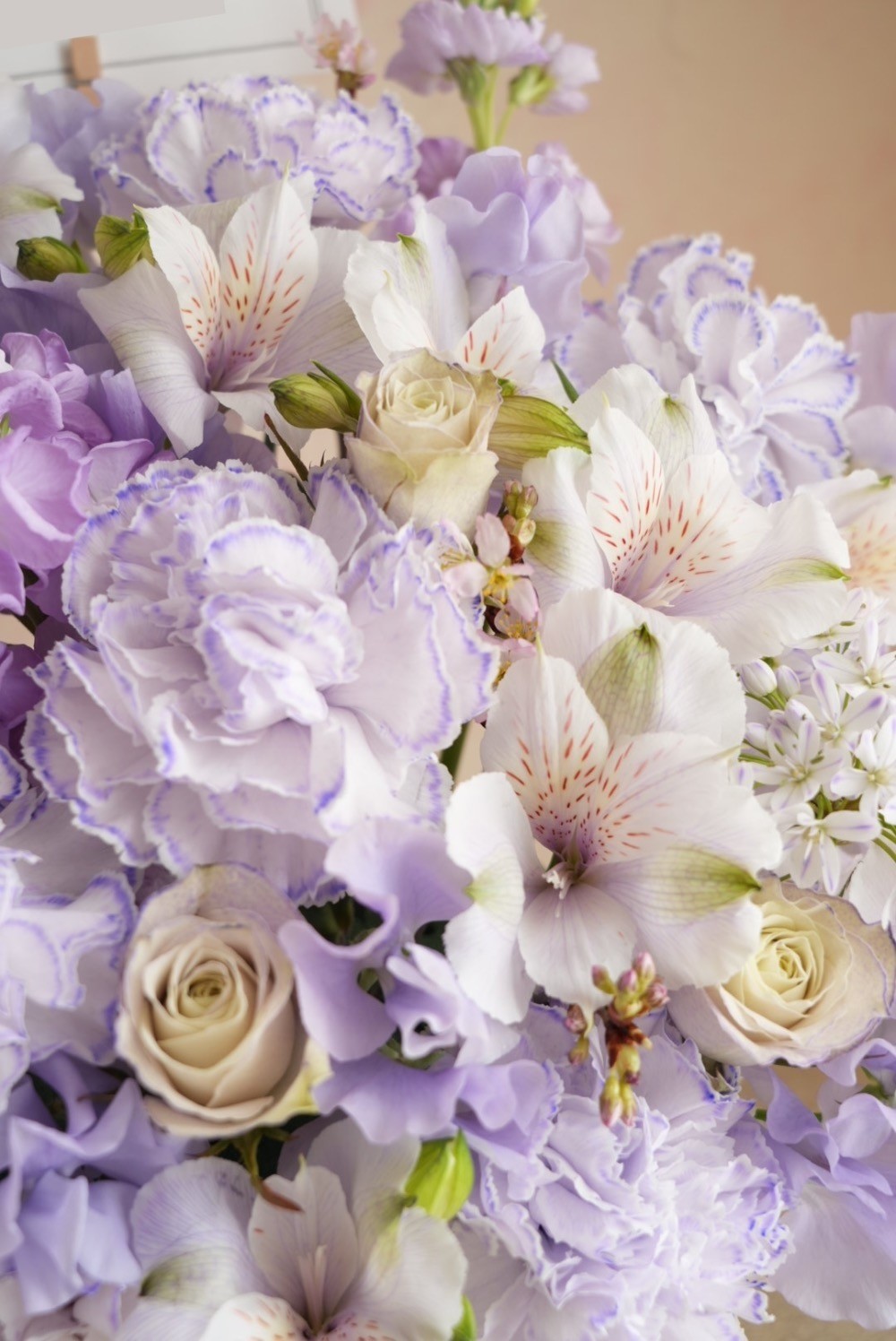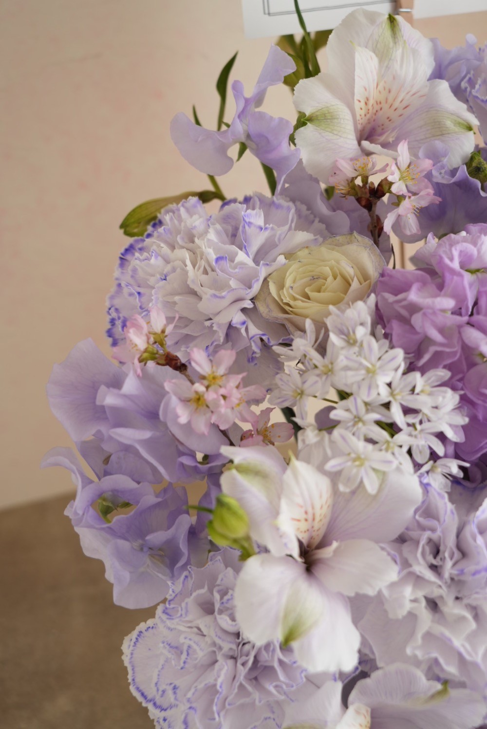 推しのメインカラーである薄紫色の可愛い雰囲気のアレンジメントで、推しの一番好きな花である桜も可能であれば使用して欲しいとオーダーしました。