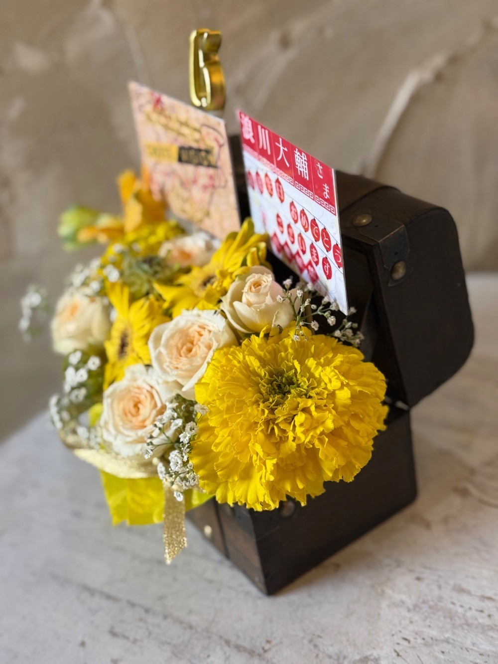 牧様のトレジャーボックスの事例がとても可愛かったので、ツアーの思い出を詰め込んだイメージで、メンバーカラーの黄色メインのお花を依頼させていただきました。