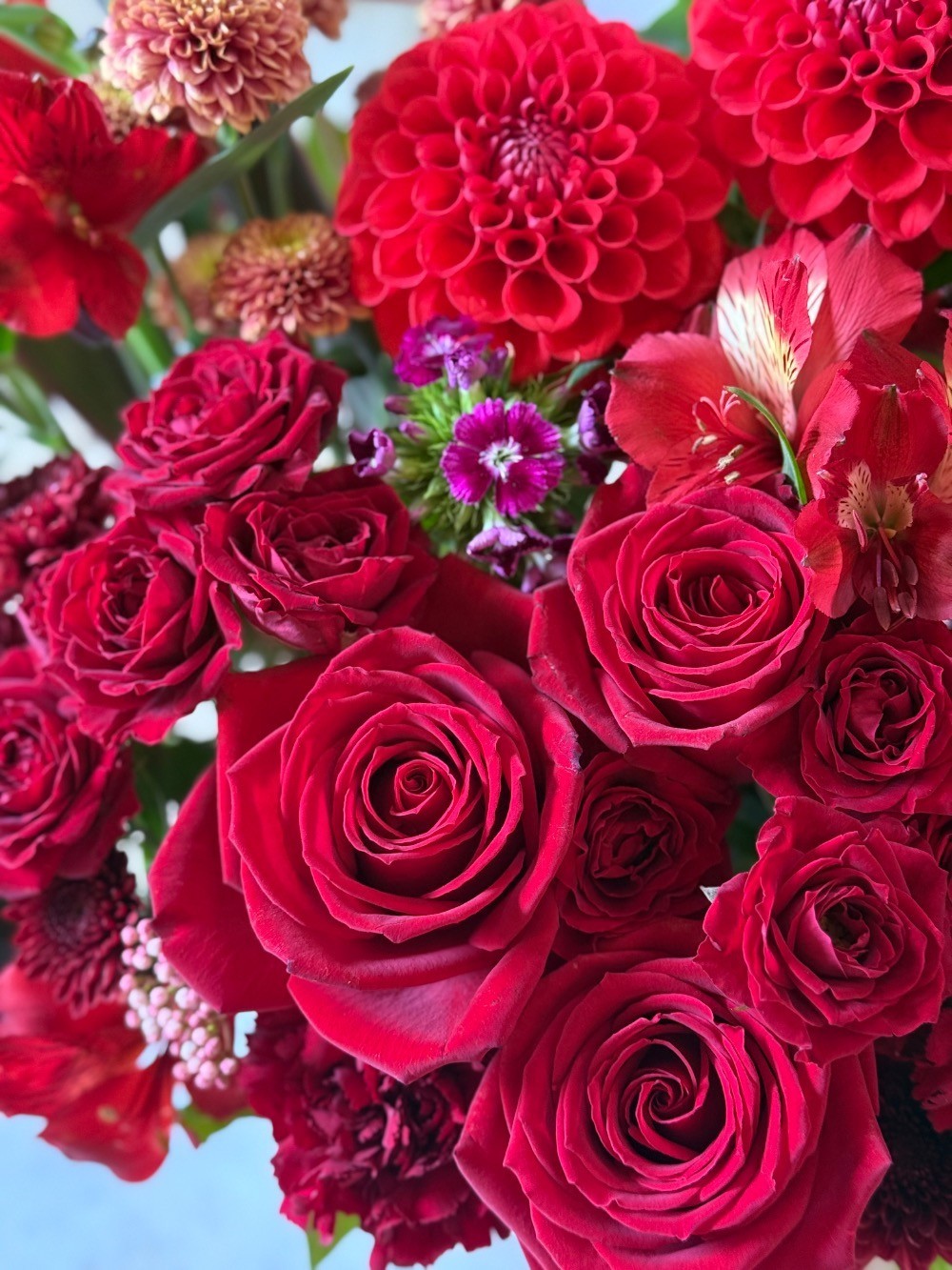 赤い薔薇がイメージの方だったので入れていただきました。その他も赤で統一してほしく、希望通りのシックで大人っぽい素敵なお花に仕上げていただきました。