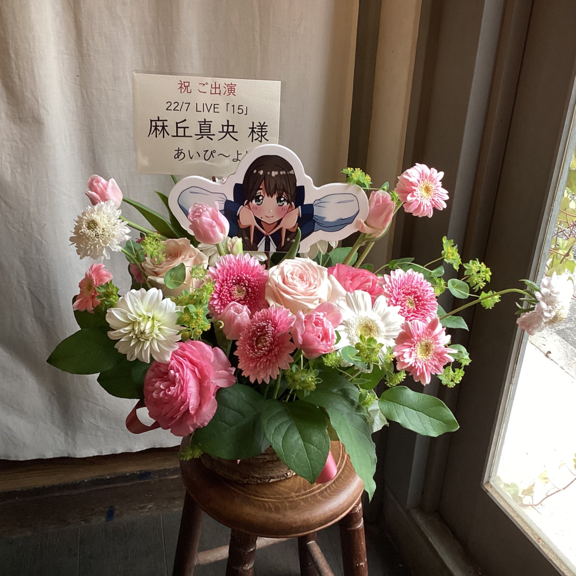 22/7 LIVE 「15」にて#sakaseru さんご協力のもと #麻丘真央 ちゃんにお花を贈りました🌸白とピンクを基調に春らしく仕上げていただいてます☺️#ナナニジ pic.twitter.com/6ZAr5OgJh7
