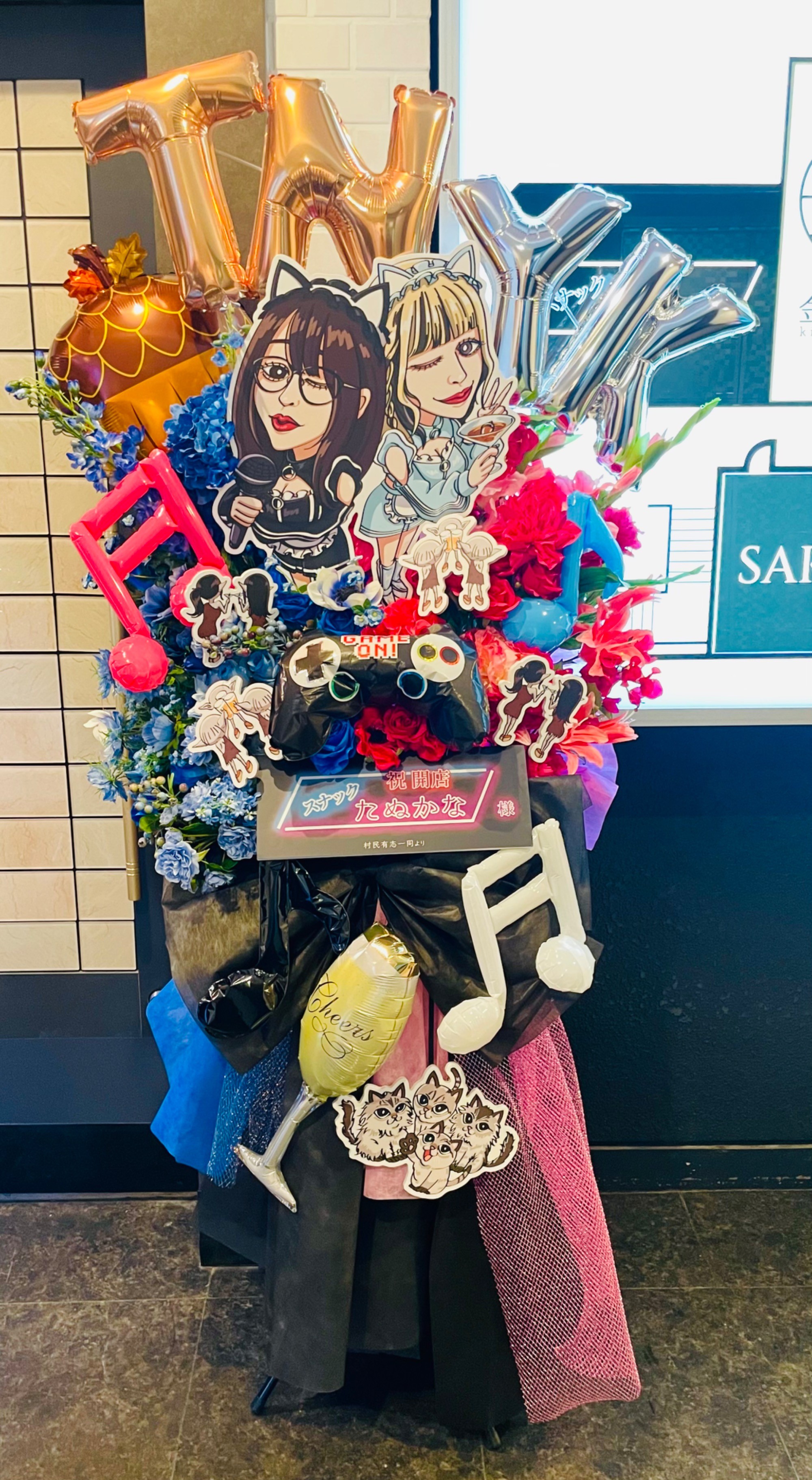 たぬかなさんと切り抜き師のお二人が一緒に育ててきた「スナックたぬかな」が、とうとうリアル店舗として実現したお祝いの気持ちを、精一杯込めてみたスタンド花です。