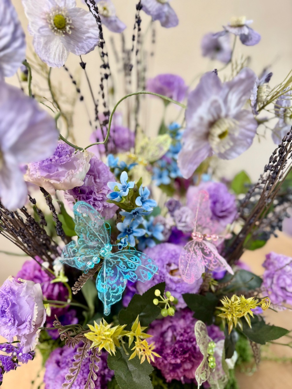 パープルがパーソナルカラーであること、また、蝶をご自身を表すイラスト等に使われる方なので、蝶を形どったアレンジメントや、難しければ蝶の飾りをあしらっていただけると嬉しい、とお願いしました。