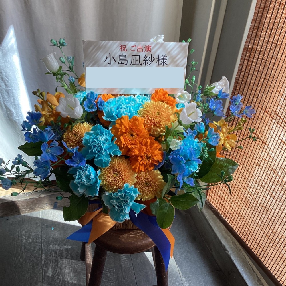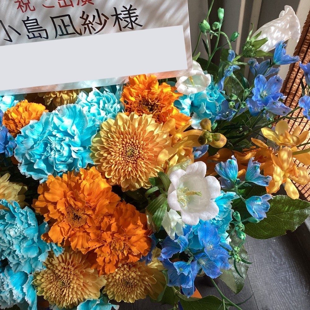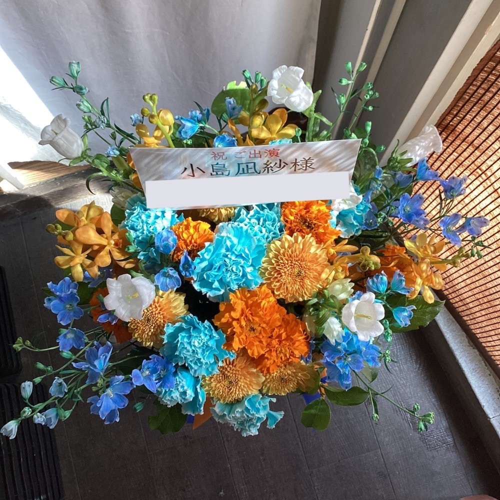 パステルブルーとオレンジはペンライトカラーといって小島凪紗さん本人が選んだカラーです。沢山の祝花が並ぶ中ですぐにご自身宛と見つけて頂けるようにお願いしました。