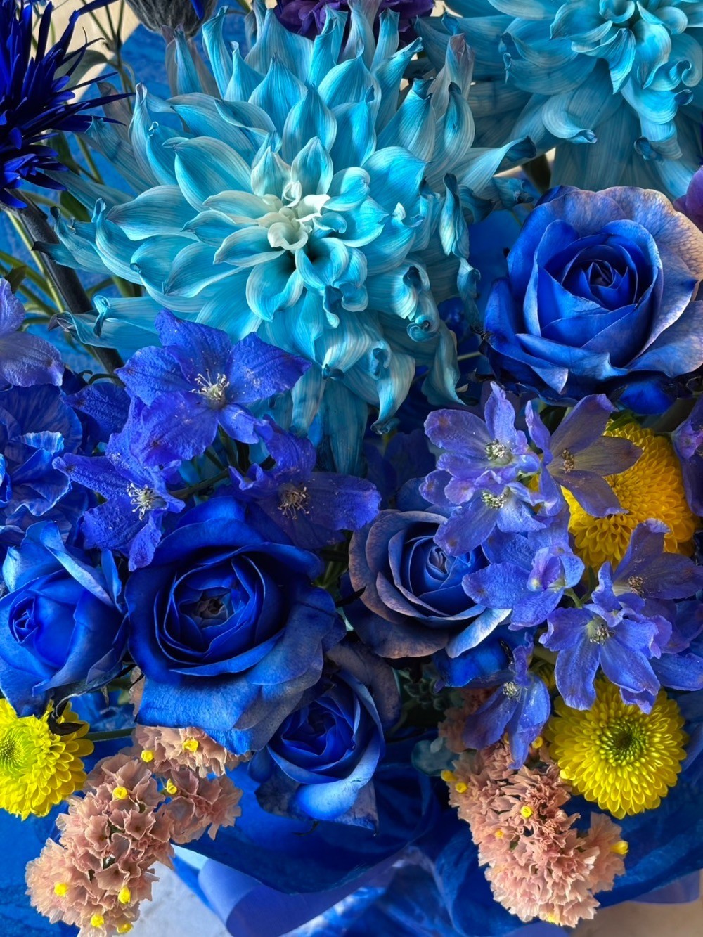 加えて、お花と花器が調和するように、お花と同様のブルー系の不織布などで花器をラッピングしていただきました。