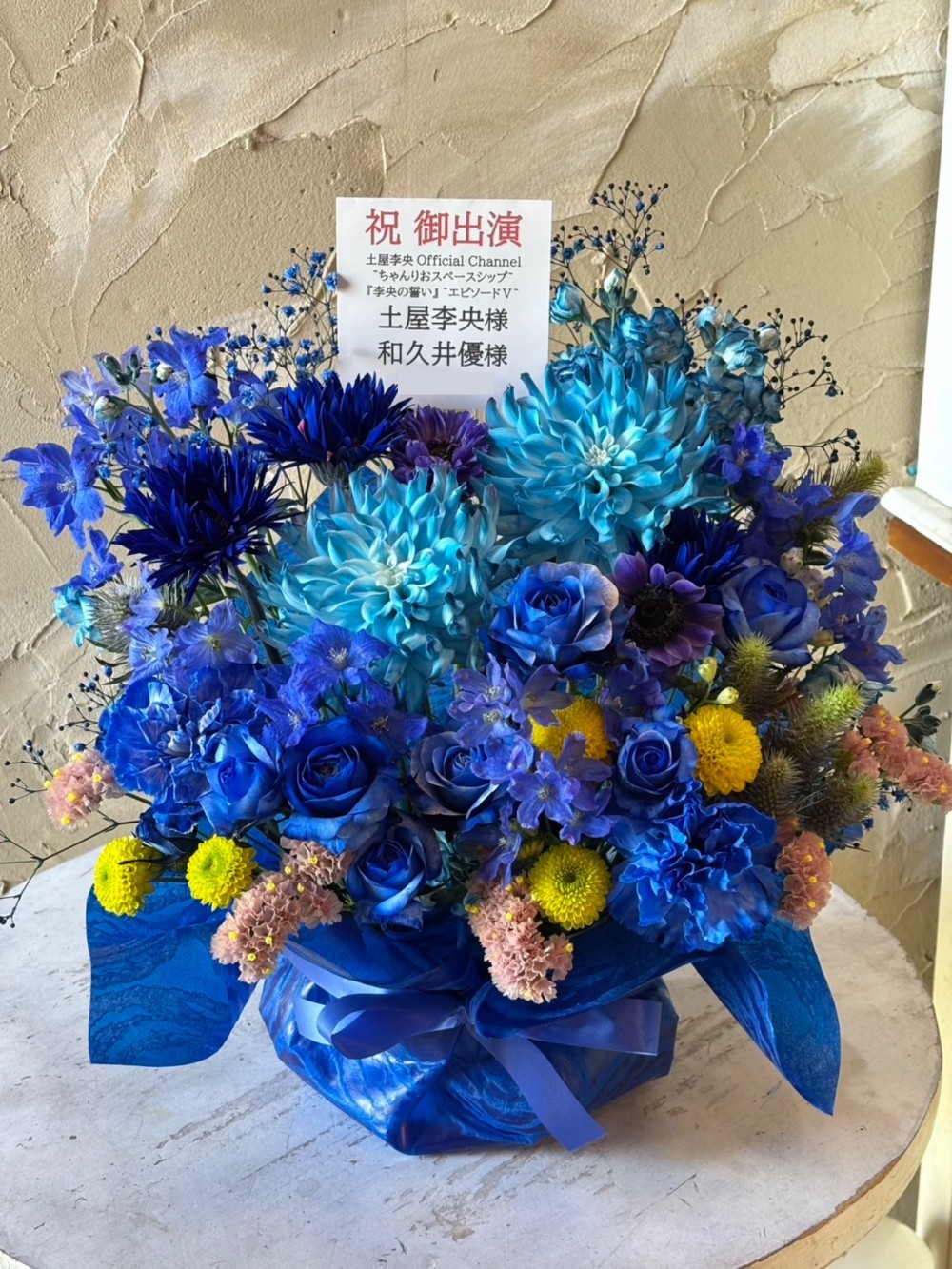 出演祝いのお花を送りたいお二人の好きな色が、青、ピンク、黄色のため、ブルー系をメインで、ピンクと黄色を差し色にしていただきました。