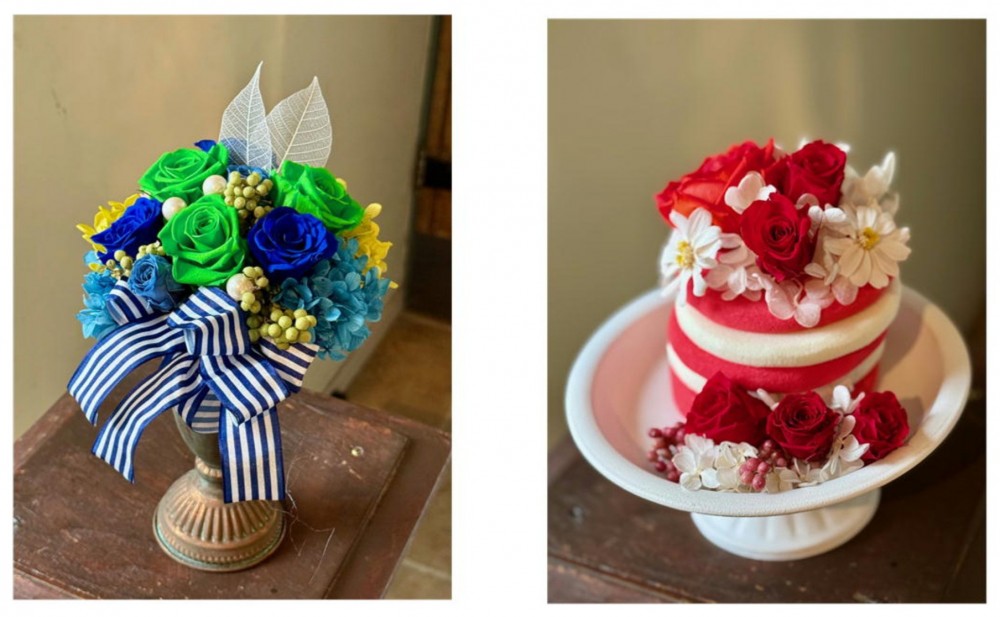 赤白の可憐アレンジと海をイメージしたブルーフラワーアレンジ