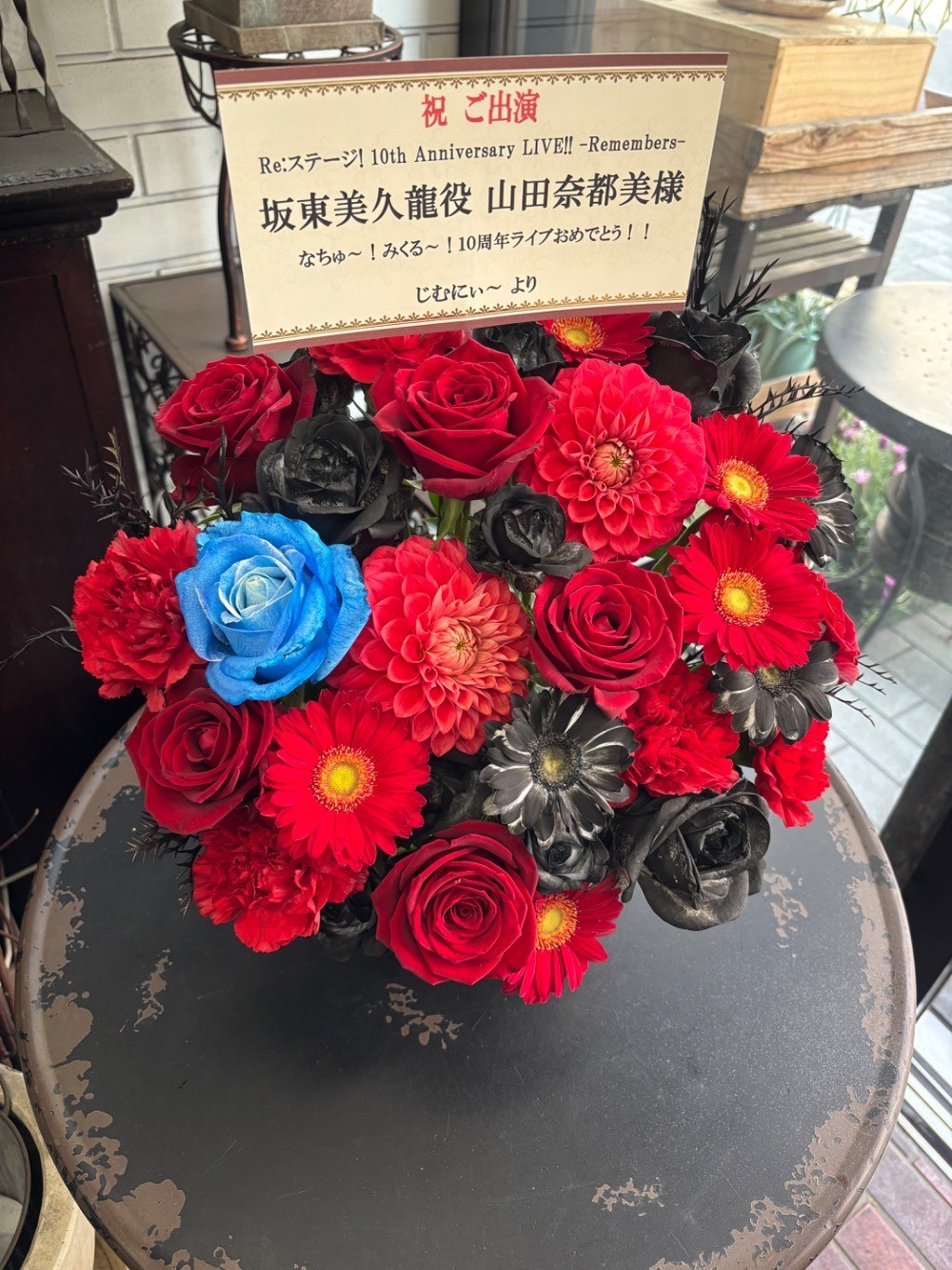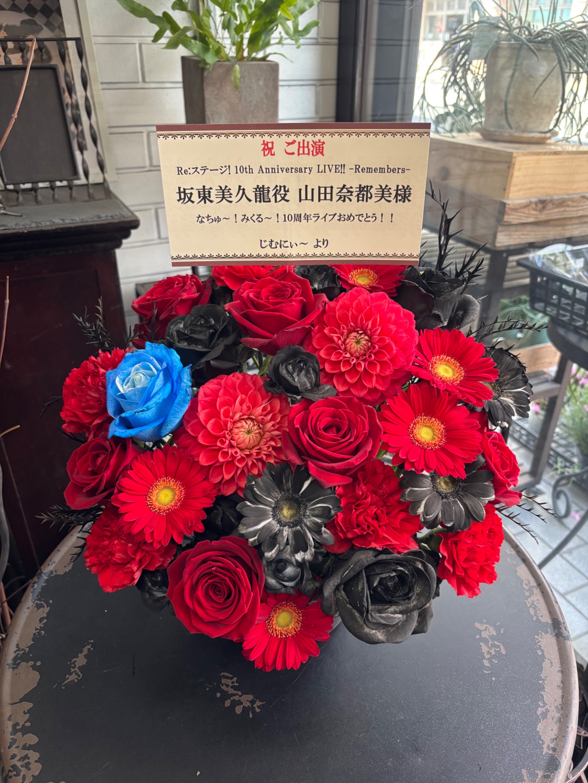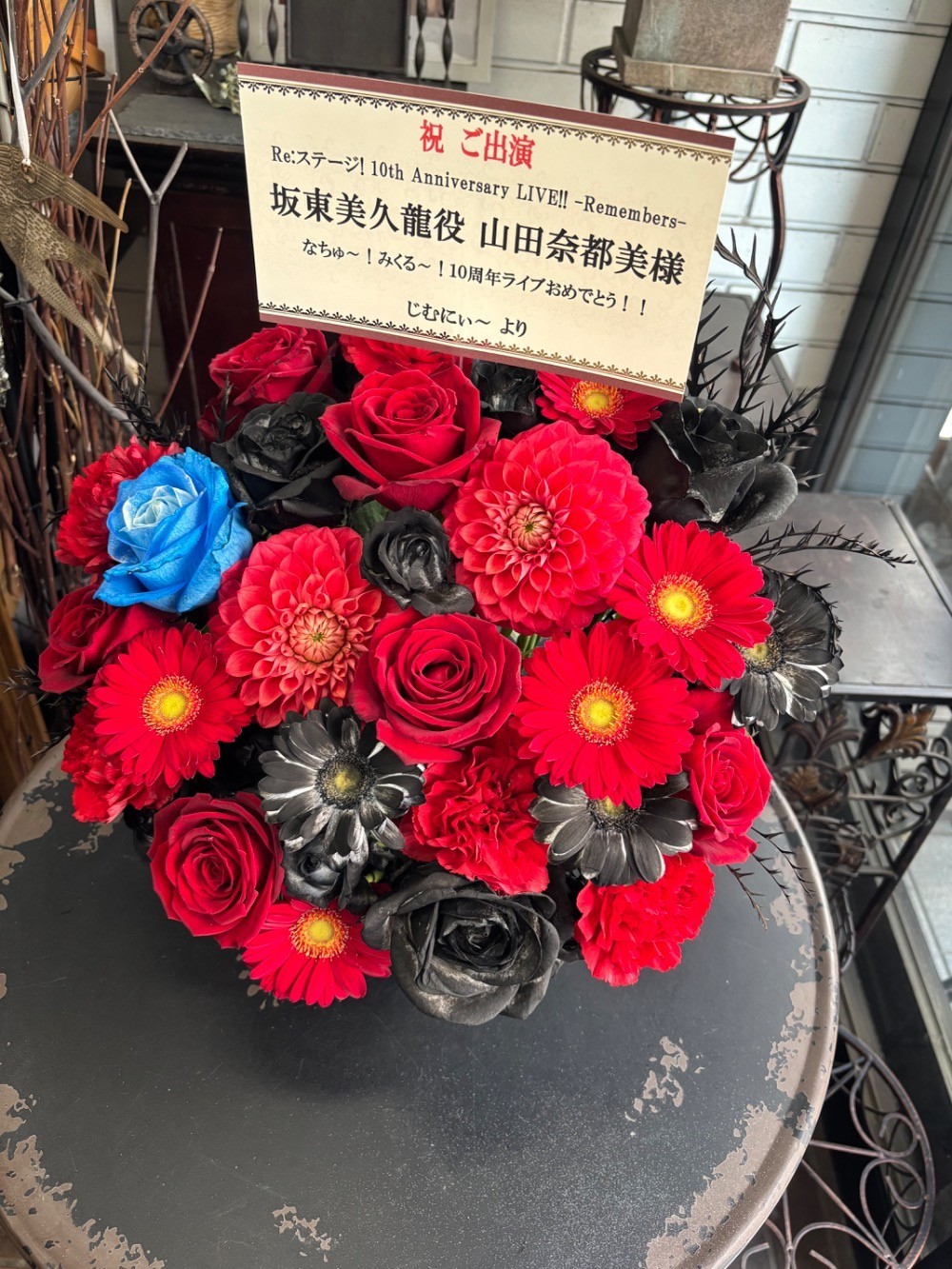 山田奈都美さん演じる坂東美久龍が所属してるアイドルユニット「テトラルキア」の衣装をイメージした、赤と黒を基調としたロックな雰囲気が出るようなお花にしてくださいとお願いしました。